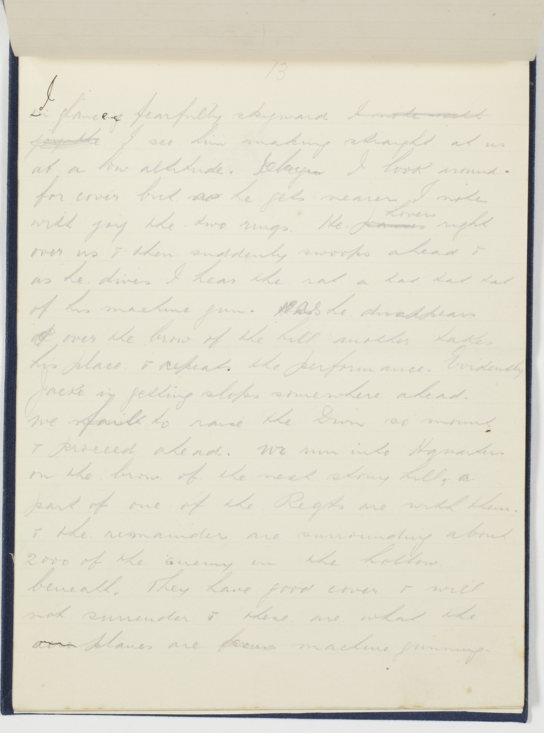 onI glancinge fearfully skyward I note with joy the I see him making straight at us at a low altitude. I begin I look around for cover but as he gets nearer I note with joy the two rings. He pauses hovers right over us & then suddenly swoops ahead & as he dives I hear the rat a tat tat tat of his machine gun. As he disappears over the brow of the hill another takes his place & repeats the performance. Evidently Jacko is getting [slops ?] somewhere ahead. We fail to raise the Divn so mount & proceed ahead. We run into Hquarters on the brow of the next stony hill, a part of one of the Regts are with them. & the remainder are surrounding about 2000 of the enemy in the hollow beneath. They have good cover & will not surrender & these are what the aero planes are xxxx machine gunning.