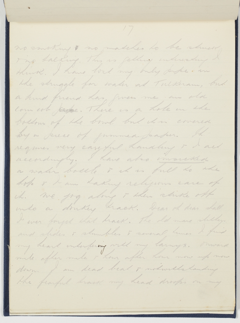 no smoking no matches to be struck & no talking. This is getting interesting I think. I have lost my only pipe in the struggle for water at Tulkeram [Tulkarm?], but a kind friend has given me an old corn cob pipe. There is a hole in the bottom of the bowl but it is covered by a piece of gummed paper. It requires very careful handling & I act accordingly. I have also [imsurked ?] a water bottle & it is full to the top & I am taking religious care of it. We jog along & then strike off into a donkey track. Dear oh dear shall I ever forget that track. The old mare slithers and slides & stumbles & several times I find my heart interfering with my larynx. Onward mile after mile & hour after hour now up now down. I am dead beat & notwithstanding the fearful track my head droops on my