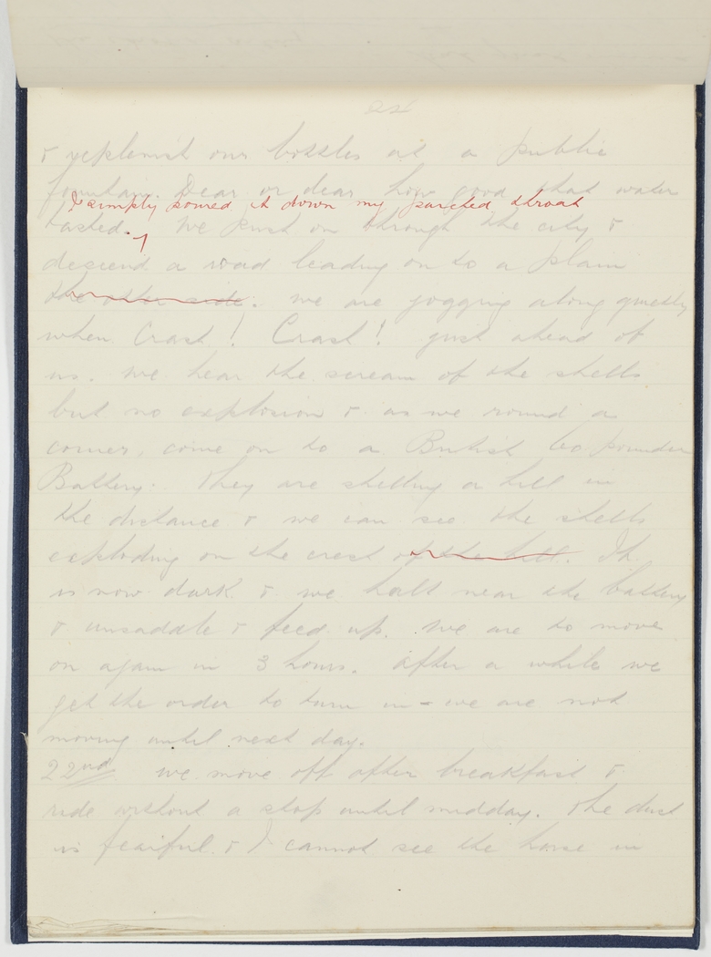 & replenish our bottles at a public fountain. Dear oh dear how good that water tasted. ^ I simply poured it down my parched throat. We push on through the city & descend a road leading on to a plain the other side. We are jogging along quietly when Crash! Crash! just ahead of us. we hear the scream of the shells but no explosion & as we round a corner, come on to a British 60 pounder Battery. They are shelling a hill in the distance & we can see the shells exploding on the crest of the hill. It is now dark & we halt near the battery & unsaddle & feed up. We are to move on again in 3 hours. After a while we get the order to turn in -- we are not moving until next day.