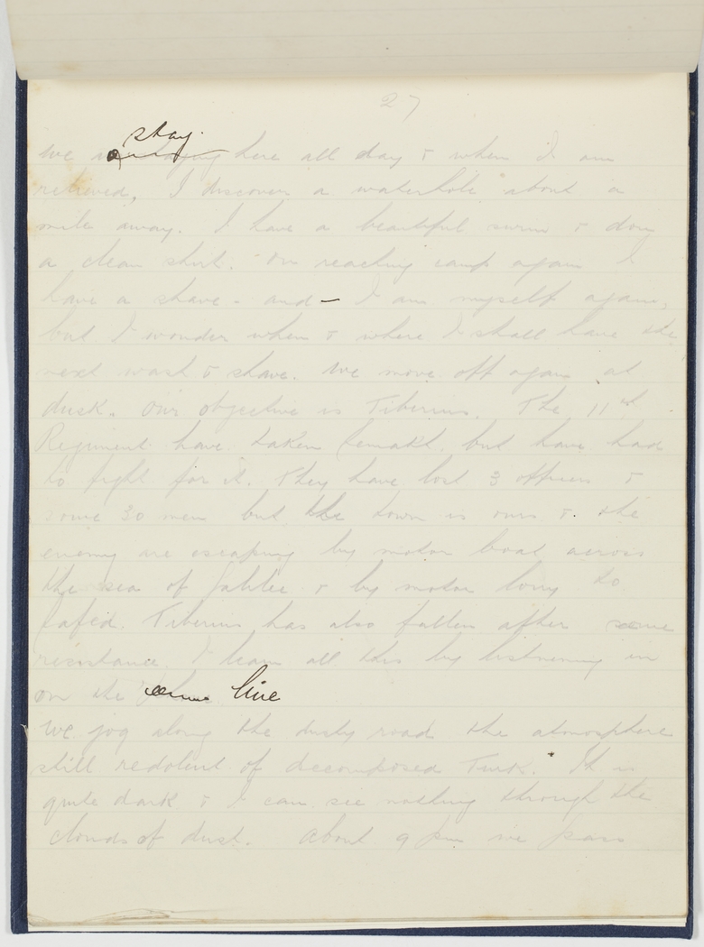 We were staying stay here all day & when I am relieved, I discover a waterhole about a mile away. I have a beautiful swim & don a clean shirt. On reaching camp again I have a shave - and – I am myself again, but I wonder when & where I shall have the next wash & shave. We move off again at dusk. Our objective is Tiberias. The 11th Regiment have taken Samakh, but have had to fight for it. They have lost 3 officers & some 30 men but the town is ours & the enemy are escaping by motor boat across the sea of Galilee & by motor lorry to Safed. Tiberias has also fallen after some resistance. I learn all this by listening in on the ???? line