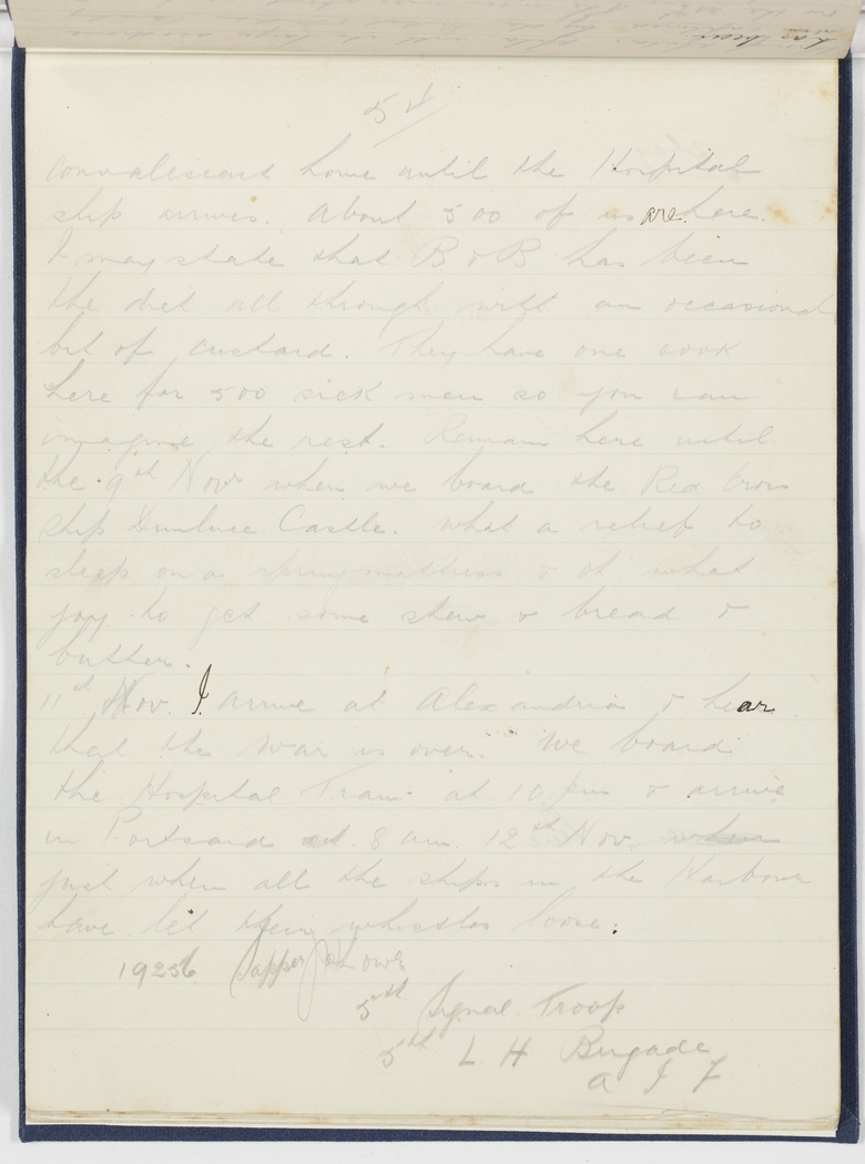 11th Nov. I arrive at Alexandria & hear that the War is over. We board the Hospital Train at 10 pm & arrive in Portsaid at 8 am 12th Nov where just when all the ships in the Harbour have let their whistles loose.