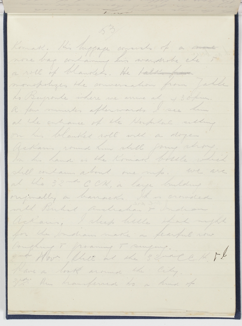 Koniak. His luggage consists of a nose nose bag containing his wardrobe etc & a roll of blankets. He talks from monopolizes the conversation from Zahle to Beyroute [Beirut?] where we arrive at 4.30 pm. A few minutes afterwards I see him at the entrance of the Hospital sitting on his blanket roll with a dozen Askaris round him still going strong. In his hands is the Koniak [cognac?] bottle which still contains about one nip. We are at the 32nd CCH, a large building originally a barracks. It is crowded with British Australian & Indian Askaris. I sleep little that night for the Indians make a fearful row Coughing & Groaning & singing.