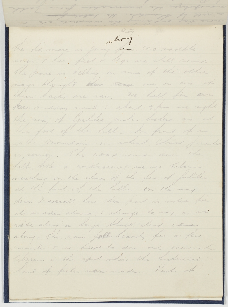 The old mare is going fine strong. No saddle sores & her feet & legs are still sound. The pace is telling on some of the other nags though & [? ?] one or two of their backs are raw. We halt for our midday meal & about 3 pm we sight the sea of Galilee miles below us at the foot of the hills. In front of us is the mountain on which Christ preached is sermon. The road winds down the hills, like a corkscrew & we see Tiberias nestling on the shore of the Sea of Galilee at the foot of the hills. On the way down I recall how this part is noted for its sudden storms & strange to say, as we ride along a large black cloud comes along. The rain falls heavily for a few minutes & we have to don our overcoats. Tiberius is the spot where the historical haul of fishes was made. Parts of