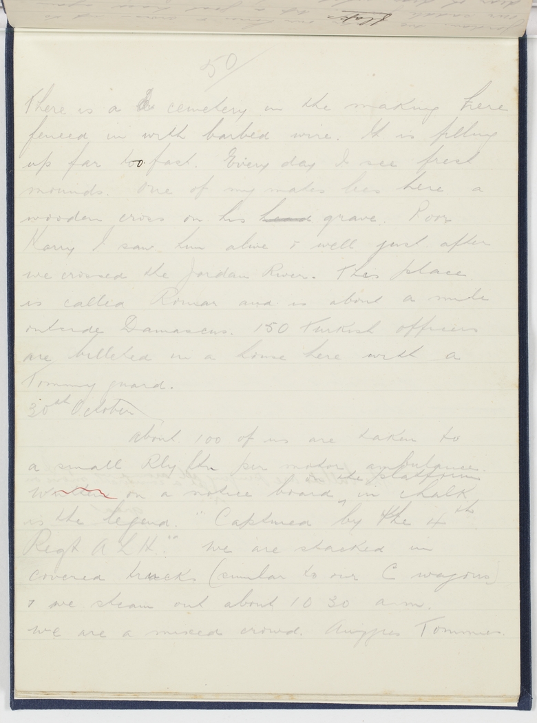 There is a cemetery in the making here fenced in with barbed wire.  It is filling up far too fast.  Every day I see fresh mounds.  One of my mates lies here a wooden cross on his head grave.  Poor Harry  I saw him alive & well just after we crossed the Jordan River.  This place is called [Rornar ?] and is about a mile outside Damascus.  150 Turkish officers are billeted in a house here with a Tommy guard.