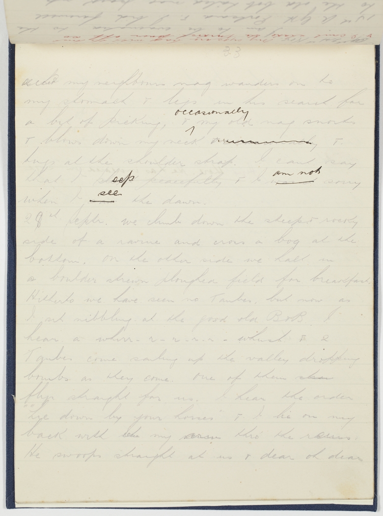 28th Septr We climb down the steep & rocky side of a ravine and cross a bog at the bottom. On the other side we halt in a boulder strewn ploughed field for breakfast. Hitherto we have seen no Taubes, but now as I sit nibbling at the good old B & B I hear a whirr - r - r - r - r - whush & 2 Taubes come sailing up the valley dropping bombs as they come. One of them strai flys straight for us. I hear the order "Lie down by your horses" & I lie on my back with my arm thro the reins. He swoops straight at us & dear oh dear
