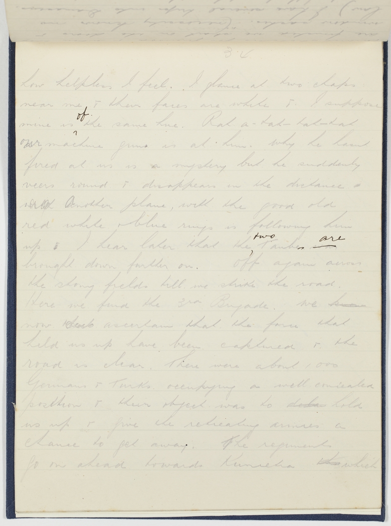 how helpless I feel. I glance at two chaps near me & their faces are white & I suppose mine is ^of the same hue. Rat a-tat-tat-tat our machine gun is at him. Why he hasnt fired at us is a mystery but he suddenly veers around & disappears in the distance with Another plane, with the good old red white & blue rings is following him up . I hear later that the ^two Taubes was are brought down further on. Off again across the stony fields till we strike the road. Here we find the 3rd Brigade. We know now that ascertain that the force that held us up have been captured & the road is clear. There were about 1000 Germans & Turks occupying a well concealed position & their object was to dela hold us up & give the retreating armies a chance to get away. The regiments go on ahead towards Kunietra whi which