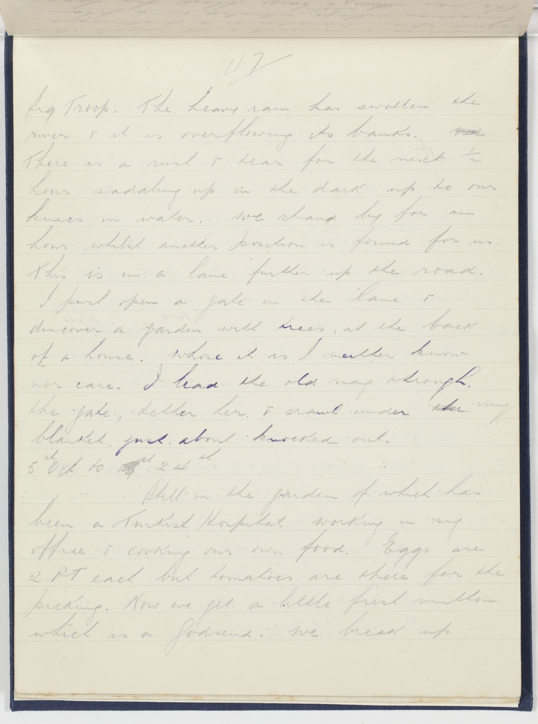 Sig Troop. The heavy rain has swollen the river & it is overflowing its banks. There is a rush & tear for the next ½ hour saddling up in the dark up to our knees in water. We stand by for an hour whilst another position is found for us. This is in a lane further up the road. I push open a gate in the lane & discover a garden with trees, at the back of a house. Whose it is I neither know nor care. I lead the old nag through the gate, tether her & crawl under the my blanket, just about knocked out.