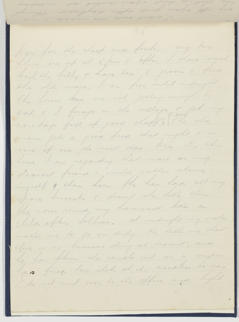 pay for the sheep and fowls. My two hours are up at 5 pm & after I shave wash boil the billy & have tea & groom & feed the old mare, I am free until midnight. The horses are not getting enough to eat & I forage in the village & get my nose bags full of good chaff & grain. The old mare gets a good feed that night & is sure of one the next day. By this time I am regarding that mare as my dearest friend & would rather starve myself than her. She has had all my spare biscuits & doesnt she like them. She noses round my haversak like a child after lollies. At midnight my mate wakes me to go on duty. He tells me that there is no business doing at present, and he has blown the candle out as a sniper has fired two shots at it. Needless to say I do not rush over to the office and light