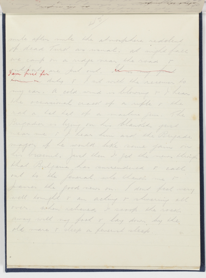 mile after mile the atmosphere redolent of dead Turk as usual. At night fall we camp on a ridge near the road & outposts are put out. It is my first turn on I am first for duty & I sit with the receiver to my ear. A cold wind is blowing & I hear the occasional crack of a rifle & the rat a tat tat of a machine gun. The Brigadier is lying on his blankets just near me & I hear him ask the Brigade major if he would like some jam on his biscuit. Just then I get the news through that Bulgaria has surrendered & call out to the General, who thanks me & passes the good news on. I dont feel very well tonight & am aching & shivering all over. When relieved I scoop the rocks away with my foot & lay down by the old mare & sleep a feverish sleep.