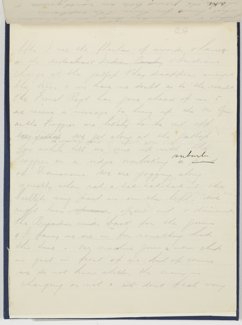 lifts. I see the flash of swords & lances as the Australian & Indian Cavalry & Indians charge at the gallop. They disappear amongst the trees & we have no doubt as to the result. The French Regt has gone ahead of us & we receive a message to hurry up the M Guns as the Froggies are likely to be cut off. We gallop We get along at the gallop for awhile till we come up with the Froggies on a ridge overlooking a part suburb of Damascus. We are jogging along quietly when rat-a-tat-tat-tat & the bullets sing past us on the left. We right turn - spread open out & dismount. The Brigadier sends back for the guns & I fancy we are in for something hot this time. Our machine guns now chip in just in front of us but of course we do not know whether the enemy is charging or not & we dont feel very