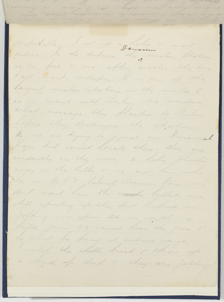 comfortable. I set up a helio & await orders. In the distance the ^Damascus wireless Station is on fire & one after another the two tall masts collapse. It is one of the largest wireless stations in the world & is in circuit with Berlin. We wonder what message they flashed to Berlin before they destroyed the station. We are trying to signal our Divisional Hqrs but cannot locate them - they are evidently on the move. A helio flashes away in the hills & we ask him who he is. A P Z Colonel [B?????] Force. We dont want him. The mach bullets are still spurting up the dirt behind us. Johnny now opens on us with a field gun. We cannot hea the gun & he must be firing at extreme range. I watch the shells burst & throw up a cloud of dirt & they are getting