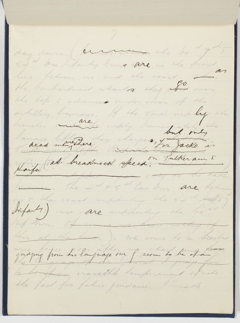 day dawns. (I understand. the 60th 7th & 54th Infantry Guns are in the front line between us and the coast. When As the bombardment starts they went go over the top & advanced under cover of the artillery barrage. If the Turks reply then trenches would be are empty. Immediately the barrage lifteds they charged, ??? Turks were left. but only dead men ^are there But few Turks were For Jacko is retiring (& at breakneck speed cavalry came in.) on Tulkeram & Haifa and never stopped again only to be taken prisoner. The 4th & 5th Cav Divs are between us & the coast supporting the 54th & 7th Infantry) & we are supporting the 60th Inf Divn. Of course we knew nothing of this at the time). We come to a barbed wire fence soon after we start and from the language of our General I judge him to be of an judging from his language our G seems to be of an irascible temperament & I note the fact for future guidance. I make