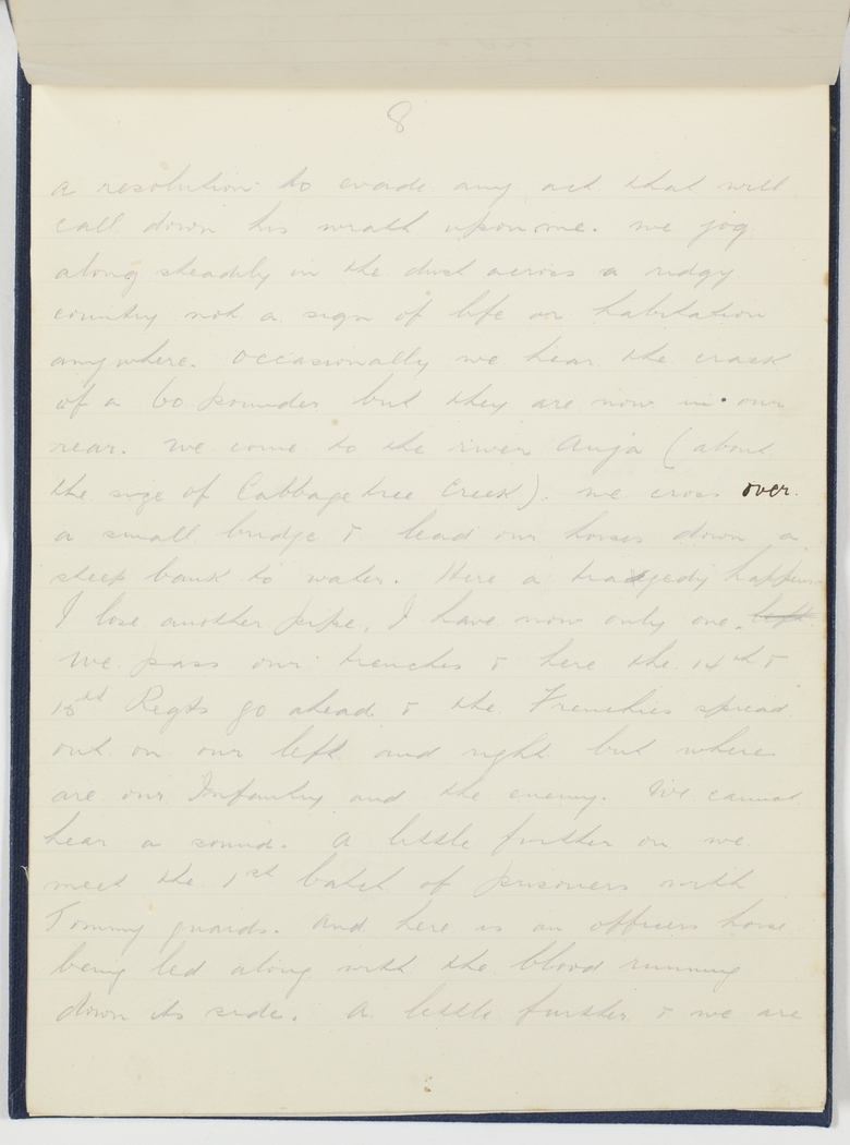a resolution to evade any act that will call down his wrath upon me. We jog along steadily in the dust across a ridgy country not a sign of life or habitation anywhere. Occasionally we hear the crack of a 60 pounder but they are now in our rear. We come to the River Anja (about the size of a Cabbage tree Creek). We cross over a small bridge & lead our horses down a steep bank to water. Here a tradjedy happens. I lose another pipe. I have now only one. left We pass our trenches & here the 14th & 15th Regts go ahead & the Frenchies spread out on our left and right but where are our Infantry and the enemy. We cannot hear a sound. A little further on we meet the 1st batch of prisoners with Tommy guards. And here is an officers horse being led away with the blood running down its side. A little further & we are