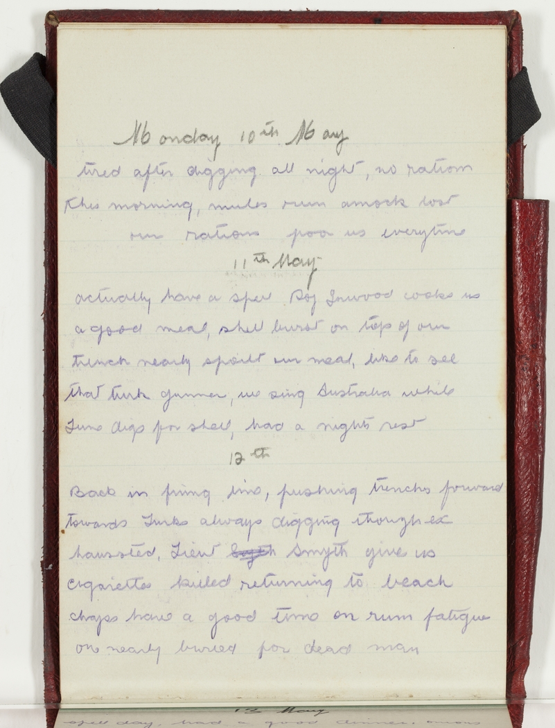 Back in firing line, pushing trenches forward towards Turks always digging though exhausted, Lieut Smyth give us cigarettes killed returning to beach chaps have a good time on rum fatigue one nearly buried for dead man