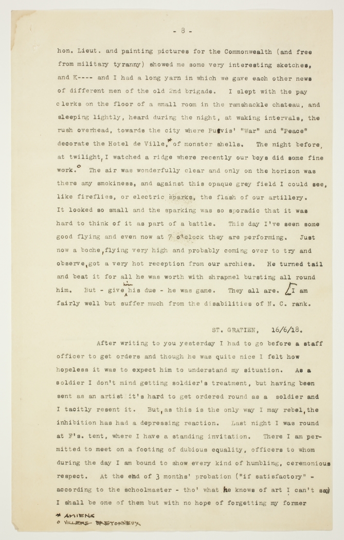 hon. Lieut, and painting pictures for the Commonwealth (and free from military tyranny) showed me some very interesting sketches, and K---- and I had a long yarn in which we gave each other news of different men of the old 2nd brigade, I slept with the pay clerks on the floor of a small room in the ramshackle chateau, and sleeping lightly, heard during the night, at waking intervals, the rush overhead, towards the city where Purvis' "War" and "Peace" decorate the Hotel de Ville*, of monster shells. The night before, at twilight, I watched a ridge where recently our boys did some fine work**. The air was wonderfully clear and only on the horizon was there any smokiness, and against this opaque grey field I could see, like fireflies, or electric sparks, the flash of our artillery. It looked so small and the sparking was so sporadic that it was hard to think of it as part of a battle. This day I've seen some good flying and even now at 7 o'clock they are performing. Just now a boche, flying very high and probably coming over to try and observe, got a very hot reception from our archies. He turned tail and beat it for all he was worth with shrapnel bursting all round him. But - give him his due - he was game. They all are.