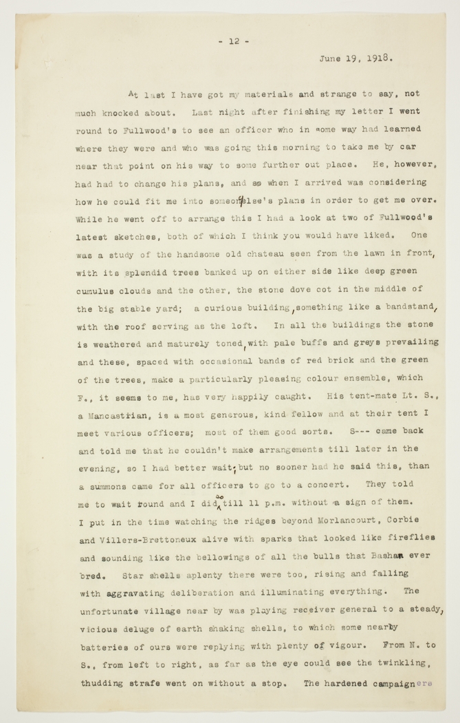 At last I have got my materials and strange to say, not much knocked about. Last night after finishing my letter I went round to Fullwood's to see an officer who in some way had learned where they were and who was going this morning to take me by car near that point on his way to some further out place. He, however, had had to change his plans, and so when I arrived was considering how he could fit me into someone else's plans in order to get me over. While he went off to arrange this I had a look at two of Fullwood's latest sketches, both of which I think you would have liked. One was a study of the handsome old chateau seen from the lawn in front, with its splendid trees banked up on either side like deep green cumulus clouds and the other, the stone dove cot in the middle of the big stable yard; a curious building, something like a bandstand, with the roof serving as the loft. In all the buildings the stone is weathered and maturely toned, with pale buffs and greys prevailing and these, spaced with occasional bands of red brick and the green of the trees, make a particularly pleasing colour ensemble, which F.. it seems to me, has very happily caught. His tent-mate Lt . S., a Mancastrian, is a most generous, kind fellow and at their tent I meet various officers; most of them good sorts. s--- came back and told me that he couldn't make arrangements till later in the evening, so I had better wait, but no sooner had he said this, than a summons came for all officers to go to a concert. They told me to wait around and I did. till 11 p.m. without a sign of them. I put in the time watching the ridges beyond Morlancourt, Corbie and Villers-Brettoneux alive with sparks that looked like fireflies and sounding like the bellowings of all the bulls that Bashan ever bred. Star shells aplenty there were too, rising and falling with aggravating deliberation and illuminating everything. The unfortunate village near by was playing receiver general to a steady, vicious deluge of earth shaking shells, to which some nearby batteries of ours were replying with plenty of vigour. From N. to S., from left to right, as far as the eye could see the twinkling, thudding strafe went on without a stop. The hardened campaigners