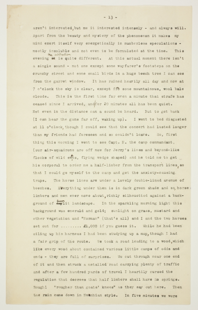 aren't interested, but me it interested intensely - and always will. Apart from the beauty and mystery of the phenomenon it makes my mind exert itself very energetically in numberless speculations - mostly insoluble and not even to be formulated at the time. This evening the situation is quite different. At this actual moment there isn't a single sound - not one except some wayfarer's footsteps on the crunchy street and some small birds in a huge beech tree I can see from the garret window. It has rained heavily all day and now at 7 o'clock the sky is clear, except for some mountainous, wool bale clouds. This is the first time for even a minute that strafe has ceased since I arrived, and for 20 minutes all has been quiet. Not even in the distance can a sound be heard. But to get back (I can hear the guns far off, waking up). I went to bed disgusted at 11 o'clock, though I could see that the concert had lasted longer than my friends had foreseen and so couldn't leave. So, first thing this morning I went to see Capt. K. the camp commandant, (our air-squadrons are off now for Jerry's lines and beyond-like flocks of wild swans, flying wedge shaped) and he told me to get his corporal to order me a half-limber from the transport lines, so that I could go myself to the camp and get the anxiety-causing, traps. The horse lines are under a lovely double-lined avenue of beeches. Everything under them is in dark green shade and so, horse: limbers and men ever move about richly silhouetted against a background of sunlit landscape. In the sparkling morning light this background was emerald and gold; sunlight on grass, mustard and other vegetation and "Norman" (that's all) and I and the two horses set out for .........£1,000 if you guess it. While he had been oiling up his harness I had been studying up a map, though I had a fair grip of the route. We took a road leading to a wood, which like every wood about contained various little camps of odds and ends - they are full of surprises. We cut through near one end of it and then struck a metalled road carrying plenty of traffic and after a few hundred yards of travel I heartily cursed the regulation that decrees that half limbers shall have no springs. Rough! "rougher than goats' knees" as they say out here. Then the rain came down in Noachian style. In five minutes we were