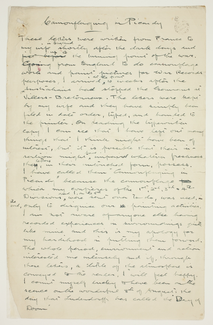 These letters were written from France to my wife in England shortly after the dark days and up to the turning point of the war. Going from England to do camouflage work and paint pictures for War Records purposes, I arrived I arrived at the front 10 weeks after the Australians had stopped the Germans at Villers-Brettoneaux. The letters were kept buy my wife and they have simply been filed in date order, typed, and handed to the printer. On reading the typewritten copy I can see that I have left out many things that I know might have been of interest, but it is possible that their insertion might have impaired whatever freshness the letters, in their intended form, possess. I have called them "Camouflaging in Picardy" because the camouflage which my confieres of the 1st, 2nd, 3rd & 4th Divisions and I, on the 5th were sent over to do, was used, in the end, only to disguise our painting activities. I am not aware of anyone else having recorded experiences in surroundings quite like mine, and this is my apologies for my hardihood in putting them forward. The whole period, environment and action interested me intensely and if, through these letters, a little of the atmosphere is conveyed to the reader, I will feel happy. I count myself lucky to have been on the scene on the wonderful 8th of August: the day that Ludendorff has called the "Day of Doom"