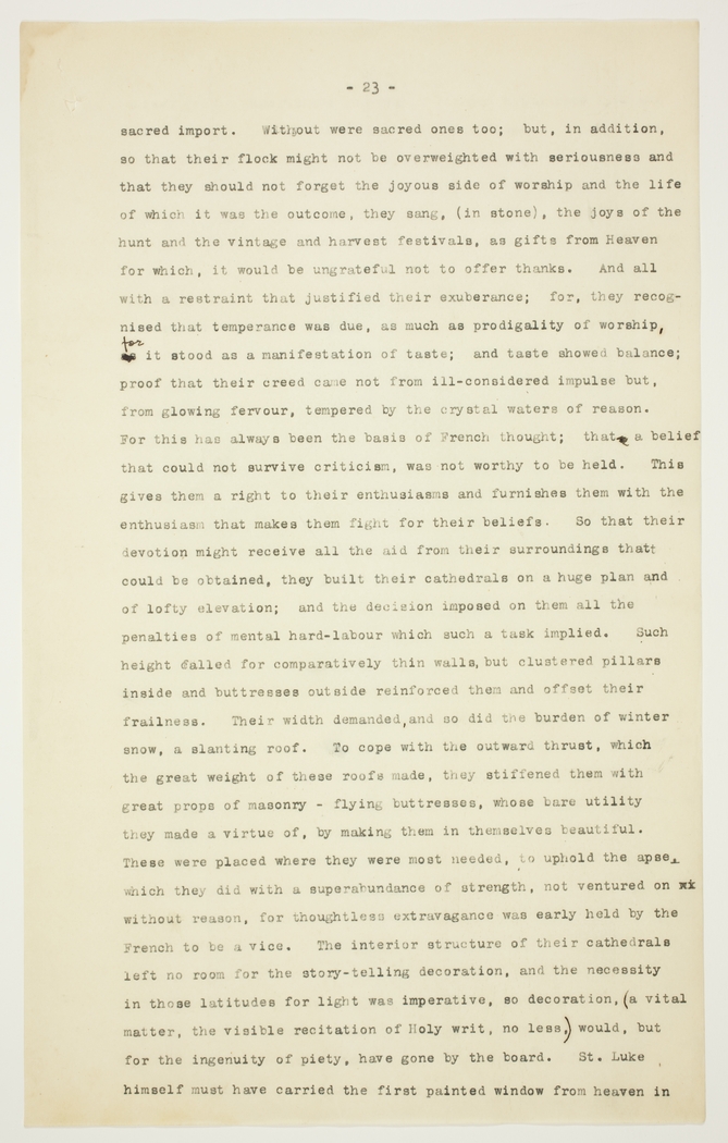 sacred import. Without were sacred ones too; but, in addition, so that their flock might not be overweighted with seriousness and that they should not forget the joyous side of worship and the life of which it was the outcome, they sang, (in stone), the joys of the hunt and the vintage and harvest festivals, as gifts from Heaven for which, it would be ungrateful not to offer thanks. And all with a restraint that justified their exuberance; for, they recognised that temperance was due, as much as prodigality of worship, it stood as a manifestation of taste; and taste showed balance; proof that their creed came not from ill considered impulse but, from glowing fervour, tempered by the crystal waters of reason, for this has always been the basis of French thought; that, a belief that could not survive criticism, was not worthy to be held. This gives them a right to their enthusiasms and furnishes them with the enthusiasm that makes them fight for their beliefs. So that their devotion might receive all the aid from their surroundings that could be obtained, they built their cathedrals on a huge plan and of lofty elevation; and the decision imposed on them all the penalties of mental hard-labour which such a task implied. Such height failed for comparatively thin walls, but clustered pillars inside and buttresses outside reinforced them and offset their frailness. Their width demanded, and so did the burden of winter snow, a slanting roof. To cope with the outward thrust, which the great weight of these roofs made, they stiffened them with great props of masonry - flying buttresses, whose bare utility they made a virtue off by making them in themselves beautiful. These were placed where they were most needed, to uphold the apse, which they did with a superabundance of strength, not ventured on without reason, for thoughtless extravagance was early held by the French to be a vice. The interior structure of their cathedrals left no room for the story-telling decoration, and the necessity in those latitudes for light was imperative, so decoration, (a vital matter, the visible recitation of Holy writ, no less) would, but for the ingenuity of piety, have gone by the board. St. Luke himself must have carried the first painted window from heaven in