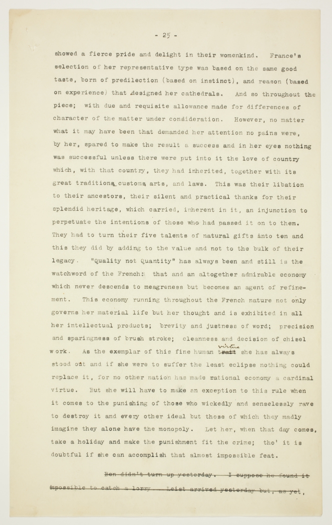 showed a fierce pride and delight in their womenkind. France's selection of her representative type was based on the same good taste, born of predilection (based on instinct), and reason (based on experience) that designed her cathedrals. And so throughout the piece; with due and requisite allowance made for differences of character of the matter under consideration. However, no matter what it may have been that demanded her attention no pains were, by her, spared to make the result a success and in her eyes nothing was successful unless there were put into it the love of country which, with that country, they had inherited, together with its great traditions, customs, arts, and laws. This was their libation to their ancestors, their silent and practical thanks for their splendid heritage, which carried, inherent in it, an injunction to perpetuate the intentions of those who had passed it on to them. They had to turn their five talents of natural gifts into ten and this they did by adding to the value and not to the bulk of their legacy. "Quality not Quantity" has always been and still is the watchword of the French: that and an altogether admirable economy which never descends to meagreness but becomes an agent of refinement. This economy running throughout the French nature not only governs her material life but her thought and is exhibited in all her intellectual products; brevity and justness of word; precision and sparingness of brush stroke; cleanness and decision of chisel work. As the exemplar of this fine human virtue she has always stood out and if she were to suffer the least eclipse nothing could replace it, for no other nation has made national economy a cardinal virtue. But she will have to make an exception to this rule when it comes to the punishing of those who wickedly and senselessly rave to destroy it and every other ideal but those of which they madly imagine they alone have the monopoly. Let her, when that day comes, take a holiday and make the punishment fit the crime; tho' it is doubtful if she can accomplish that almost impossible feat.