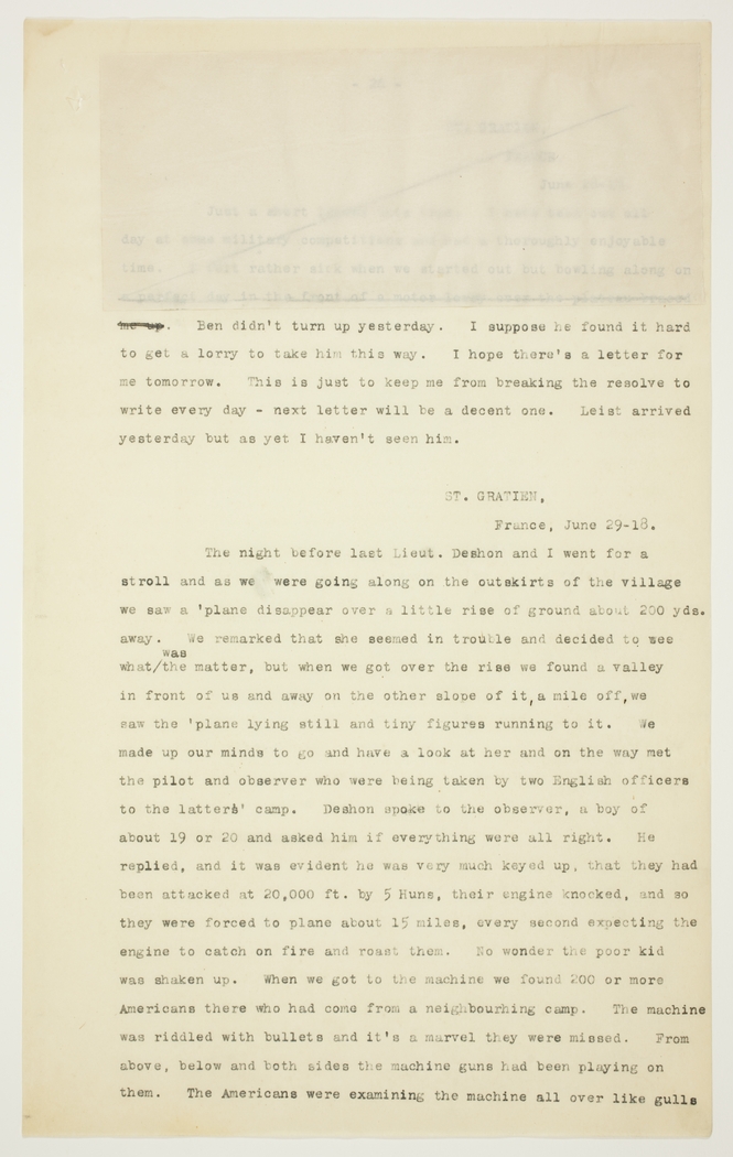 The night before last Lieut. Deshon and I went for a stroll and as we were going along on the outskirts of the village we saw a 'plane disappear over a little rise of ground about 200 yds. away. We remarked that she seemed in trouble and decided to see what was the matter, but when we got over the rise we found a valley in front of us and away on the other slope of it, a mile off, we saw the 'plane lying still and tiny figures running to it. We made up our minds to go and have a look at her and on the way met the pilot and observer who were being taken by two English officers to the latters' camp. Deshon spoke to the observer, a boy of about 19 or 20 and asked him if everything were all right. He replied, and it was evident he was very much keyed up, that they had been attacked at 20,000 ft. by 5 Huns, their engine knocked, and so they were forced to plane about 15 miles, every second expecting the engine to catch on fire and roast them. No wonder the poor kid was shaken up. When we got to the machine we found 200 or more Americans there who had come from a neighbouring camp. The machine was riddled with bullets and it's a marvel they were missed. From above, below and both sides the machine guns had been playing on them. The Americans were examining the machine all over like gulls