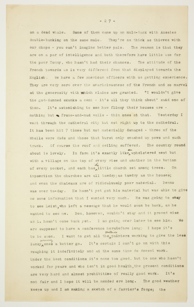 on a dead whale. Some of them came up on mule-back with Aussies double-banking on the same mule. They're as thick as thieves with our chaps - you can't imagine better pals. The reason is that they are on a par of intelligence and both therefore have little use for the poor Tommy, who hasn't had their chances. The attitude of the French towards us is very different from that displayed towards the English. We have a few American officers with us getting experience. They are very sore over the avariciousness of the French and so marvel at the generosity with which claims are granted. "I wouldn't give the god-damned skunks a cent - it's all they think about" said one of them. It's astonishing to see how flimsy their houses are - nothing but frame-and-mud walls - thin ones at that. Yesterday I went through the cathedral city but not right up to the cathedral. It has been hit 7 times but not materially damaged - three of the shells were duds and those that burst only smashed up pews and such truck. Of course the roof and ceiling suffered. The country round about is lovely. In form it's exactly like an upholstered seat but with a village on the top of every rise and another in the bottom of every pocket, and each has a little church set among trees. On inpsection the churches are all tawdry; as tawdry as the houses; and even the chateaux are of ridiculously poor material. Benno was over to-day. He hasn't yet got his material but was able to give me some information that I wanted very much. He was going to stay to see Leist, who left a message that he would soon be back, as he wanted to see me. Ben, however, wouldn't stay and it proved wise as L. hasn't come back yet. I am going over later to see him. We are supposed to have a conference here before long; I hope it's to be soon. I want to get all the outside painters working to give the less lucky army ones a better go. It's certain I can't go on with this roughing it indefinitely and at the same time do decent work. Under the best conditions it's none too good, but to one who hasn't worked for years and who isn't in good health, the present conditions are very hard and almost prohibitive of really good work. It's not fair and I hope it will be mended ere long. The good weather keeps up and I am making a sketch of a farrier's forge; the