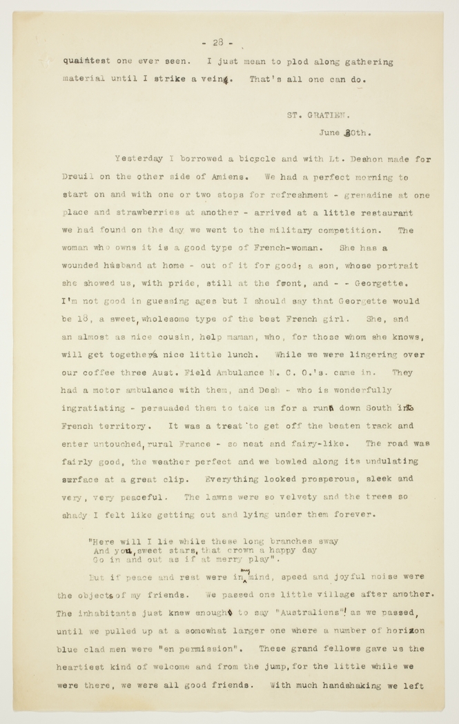 Yesterday I borrowed a bicycle and with Lt. Deshon made for Dreuil on the other side of Amiens. We had a perfect morning to start on and with one or two stops for refreshment - grenadine at one place and strawberries at another - arrived at a little restaurant we had found on the day we went to the military competition. The woman who owns it is a good type of French -woman. She has a wounded husband at home - out of it for good; a son, whose portrait she showed us, with pride, still at the front, and - - Georgette. I'm not good in guessing ages but I should say that Georgette would be 18, a sweet wholesome type of the best French girl. She, and an almost as nice cousin, help maman, who, for those whom she knows, will get together nice little lunch. While we were lingering over our coffee three Aust. field Ambulance N. C. 0.'s. came in. They had a motor ambulance with them, and Desh - who is wonderfully ingratiating - persuaded them to take us for a run down South into French territory. It was a treat to get off the beaten track and enter untouched, rural France - so neat and fairy-like. The road was fairly good, the weather perfect and we bowled along its undulating surface at a great clip. Everything looked prosperous, sleek and very, very peaceful. The lawns were so velvety and the trees so shady I felt like getting out and lying under them forever.