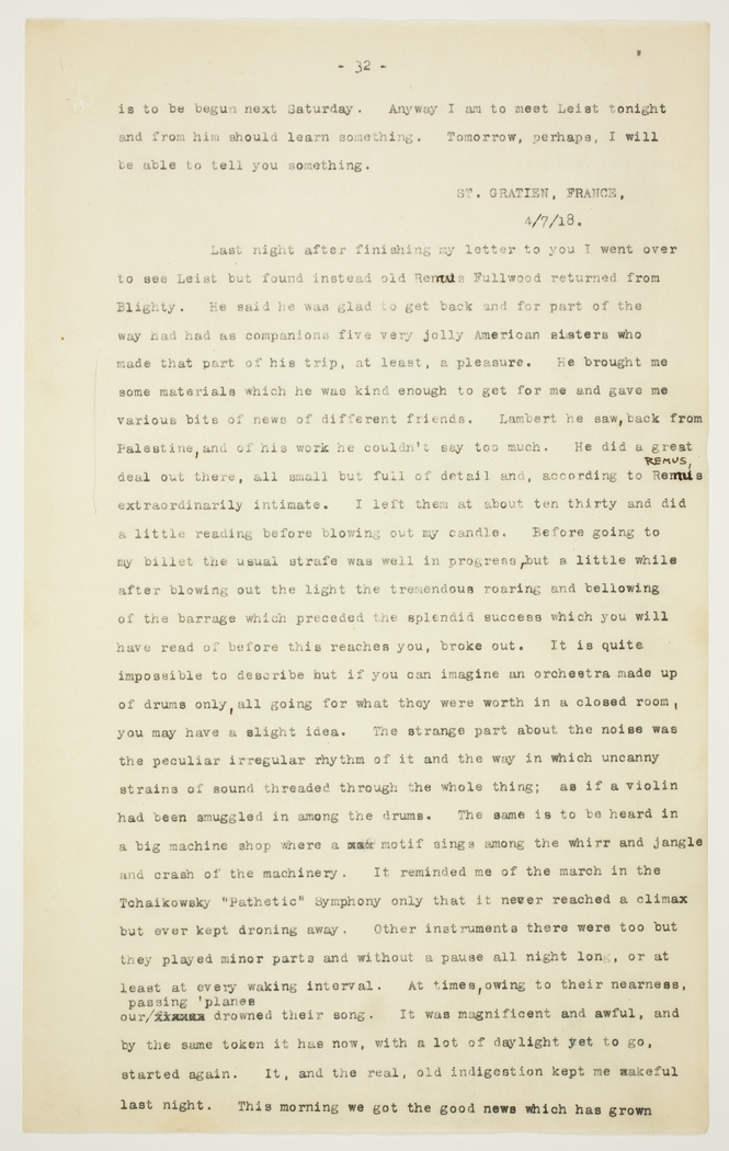 Last night after finishing my letter to you I went over to see Leist but found instead old Rentals Fullwood returned from Blighty. He said he was glad to get back and for part of the way had had as companions five very jolly American sisters who made that part of his trip, at least, a pleasure. He brought me some materials which he was kind enough to get for me and gave me various bits of news of different friends. Lambert he saw, back from Palestine, and of his work he couldn't say too much. He did a great deal out there, all small but full of detail and, according to Remus is extraordinarily intimate. I left them at about ten thirty and did a little reading before blowing out my candle. Before going to my billet the usual strafe was well in progress but a little while after blowing out the light the tremendous roaring and bellowing of the barrage which preceded the splendid success which you will have read of before this reaches you, broke out. It is quite impossible to describe but if you can imagine an orchestra made up of drums only all going for what they were worth in a closed room, you may have a slight idea. The strange part about the noise was the peculiar irregular rhythm of it and the way in which uncanny strains of sound threaded through the whole thing; as if a violin had been smuggled in among the drums. The same is to be heard in a big machine shop where a motif sings among the whirr and jangle and crash of the machinery. It reminded me of the march in the Tchaikowsky "Pathetic" Symphony only that it never reached a climax but ever kept droning away.
