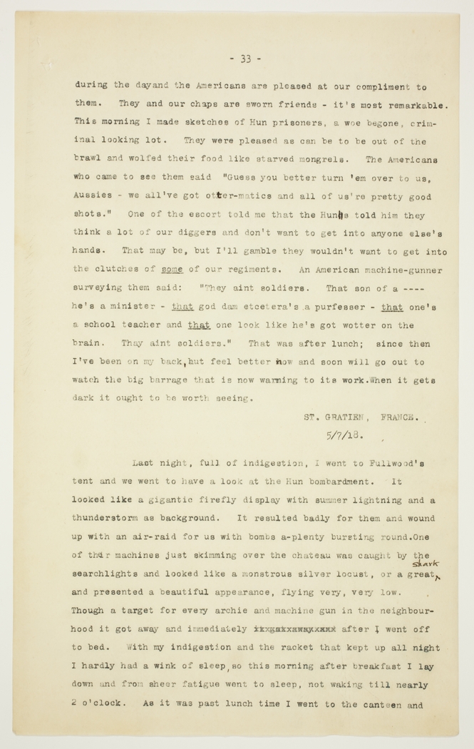 during the day and the Americans are pleased at our compliment to them. They and our chaps are sworn friends - it's most remarkable. This morning I made sketches of Hun prisoners, a woe begone, criminal looking lot. They were pleased as can be to be out of the brawl and wolfed their food like starved mongrels. The Americans who came to see them said "Guess you better turn 'em over to us, Aussies - we all've got otter-matics and all of us're pretty good shots." One of the escort told me that the Huns told him they think a lot of our diggers and don't want to get into anyone else's hands. That may be, but I'll gamble they wouldn't want to get into the clutches of some of our regiments. An American machine-gunner surveying them said: "They aint soldiers. That son of a...... he's a minister - that god dam etcetera's a purfesser - that one's a school teacher and that one look like he's got wotter on the brain. Thay aint soldiers." That was after lunch; since then I've been on my back, hut feel better how and soon will go out to watch the big barrage that is now warming to its work .When it gets dark it ought to be worth seeing.