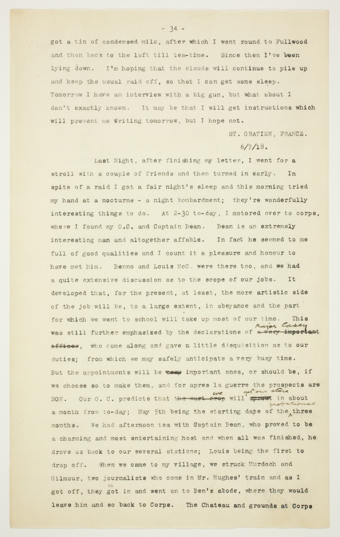 Last Night, after finishing my letter, I went for a stroll with a couple of friends and then turned in early. In spite of a raid I got a fair night's sleep and this morning tried my hand at a nocturne - a night bombardment; they're wonderfully interesting things to do. At 2-30 to-day, I motored over to corps, where I found my 0.C. and Captain Bean. Bean is an extremely interesting man and altogether affable. In fact he seemed to me full of good qualities and I count it a pleasure and honour to have met him. Benno and Louis McC. were there too, and we had a quite extensive discussion as to the scope of our jobs. It developed that, for the present, at least, the more artistic side of the job will be, to a large extent, in abeyance and the part for which we went to school will take up most of our time. This was still further emphasized by the declarations of Major Casey who came along and gave a little disquisition as to our duties; from which we may safely anticipate a very busy time. But the appointments will be important ones, or should be, if we choose so to make them, and for apres la guerre the prospects are