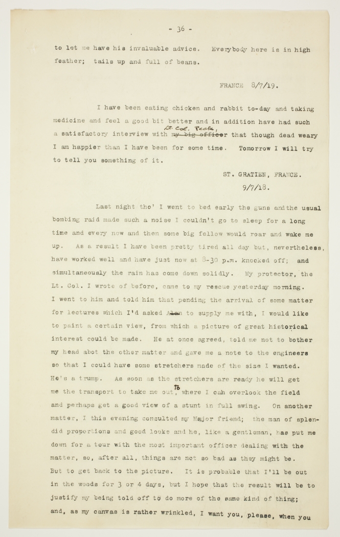 I have been eating chicken and rabbit to-day and taking medicine and feel a good bit better and in addition have had such a satisfactory interview with Lt. Col. Peck that though dead weary I am happier than I have been for some time. Tomorrow I will try to tell you something of it.