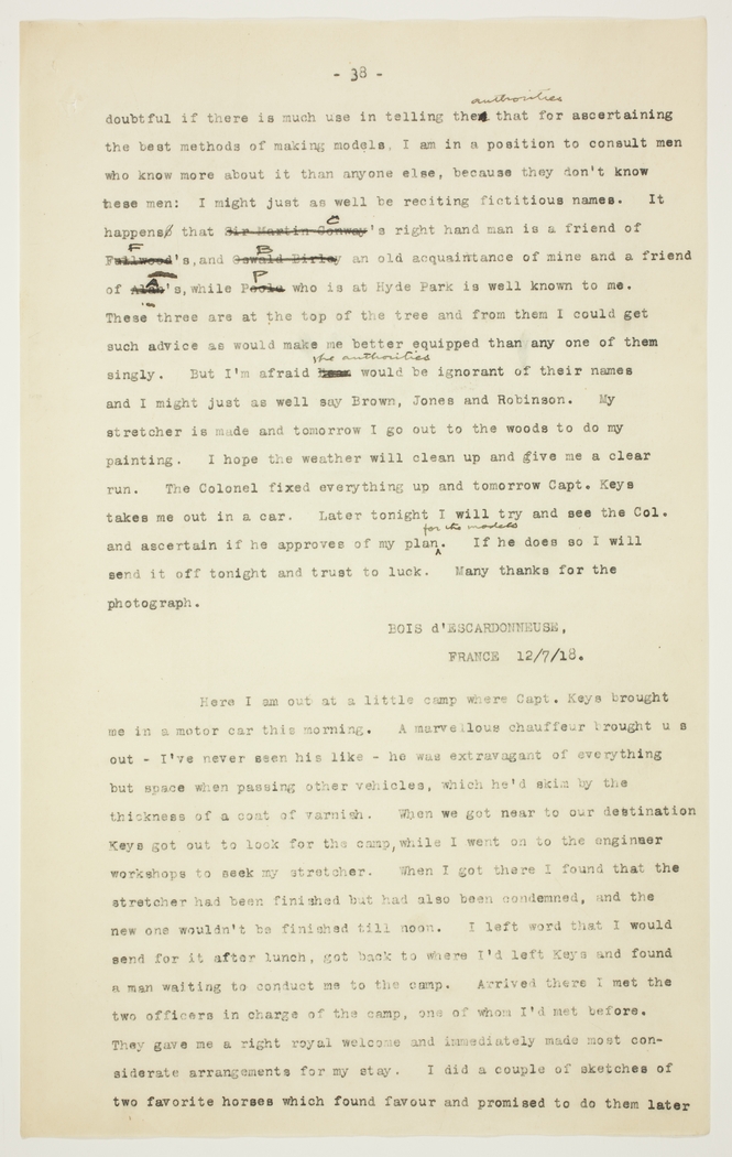 doubtful if there is much use in telling the authorities that for ascertaining the best methods of making models, I am in a position to consult men who know more about it than anyone else, because they don't know these men: I might just as well be reciting fictitious names. It happens that Sir Harris Conway C's right hand man is a friend of strike>Fullwoods F and Oswald Birley B an old acquaintance of mine and a friend of Alan A's while Poole P who is at Hyde Park is well known to me. These three are at the top of the tree and from them I could get such advice as would make me better equipped than any one of them singly. But I'm afraid the authorities would be ignorant of their names and I might just as well say Brown, Jones and Robinson. My stretcher is made and tomorrow I go out to the woods to do my painting. I hope the weather will clean up and give me a clear run. The Colonel fixed everything up and tomorrow Capt. Keys takes me out in a car. Later tonight I will try and see the Col. and ascertain if he approves of my plan for the models. If he does so I will send it off tonight and trust to luck. Many thanks for the photograph.