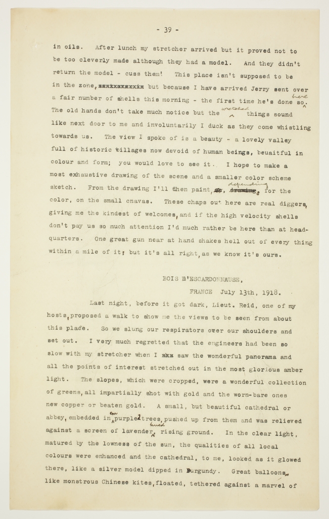 Last night, before it got dark, Lieut. Reid, one of my hosts, proposed a walk to show me the views to be seen from about this place. So we slung our respirators over our shoulders and set out. I very much regretted that the engineers had been so slow with my stretcher when I saw the wonderful panorama and all the points of interest stretched out in the most glorious amber light. The slopes, which were cropped, were a wonderful collection of greens, all impartially shot with gold and the worn-bare ones new copper or beaten gold. A small, but beautiful cathedral or abbey, embedded in empurpled trees, pushed up from them and was relieved against a screen of lavender, rising ground. In the clear light, matured by the lowness of the sun, the qualities of all local colours were enhanced and the cathedral, to me, looked as it glowed there, like a silver model dipped in Burgundy. Great balloons, like monstrous Chinese kites, floated, tethered against a marvel of