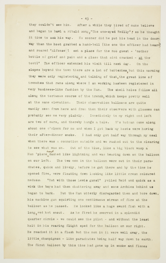 they couldn't see him. After a while they tired of make believe and began to bawl a ribald song, "The one-eyed Reilly"; so he thought it time to ask his way. No sooner did he put his head in the door way than the host grabbed a hand-bell (the one the officer had heard and roared "Alfonso! set a place for the noo guest - 'nother bottle of grief and pain and a glass that aint cracked – at the tootl" The officer extended his visit till next day. On the slopes beyond the town there are a lot of batteries but this morning they were only registering, and talking of that, the great line of trenches that runs along where I am working has been registered in very business-like fashion by the Hun. The shell holes follow all along the tortuous course of the trench, which keeps pretty well at the same elevation. Their observation balloons are quite easily seen from here and from them their observers with glasses can probably see me very plainly. Immediately to my right and left are two of ours, and thereby hangs a tale. R's batman came along about one o'clock for me and when I got back my hosts were having their after-dinner smoke. I had only got half way through my meal when there was a commotion outside and we rushed out to the clearing to see what was on. Out of the blue, like a big black wasp a Hun 'plane had dashed like lightning and was bearing down on the balloon on our left. The two men in the balloon were out in their parachutes, quick and lively, before he got there and by the time he opened fire, were floating down looking like little cream coloured medusae. "Out with those Lewis guns!" yelled Reid and quick as a wink the boys had them chattering away and some Archies behind us began to bark. But the Hun utterly disregarded them and bore down, his machine gun squirting one continuous stream of fire at the balloon as he passed. He looked like a huge sword fish with a long, red hot snout. As he fired he swerved in a splendid quarter circle - we could see the pilot - and without the least halt in his roaring flight sped for the balloon on our right. He reached it in a flash but the men in it were well away, the little, champignon - like parachutes being half way down to earth. The first balloon by this time had gone up in smoke and flames