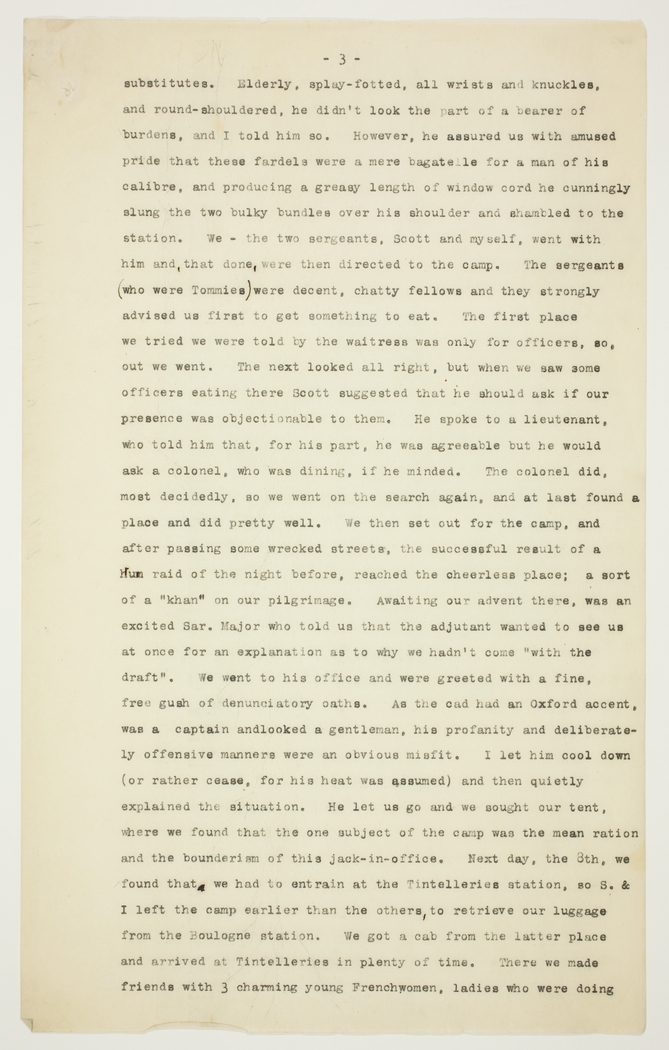 substitutes. Elderly, splay-footed, all wrists and knuckles, and round-shouldered, he didn't look the part of a bearer of burdens, and I told him so. However, he assured us with amused pride that these fardels were a mere bagatelle for a man of his calibre, and producing a greasy length of window cord he cunningly slung the two bulky bundles over his shoulder and shambled to the station. We - the two sergeants, Scott and myself, went with him and, that done, were then directed to the camp. The sergeants (who were Tommies) were decent, chatty fellows and they strongly advised us first to get something to eat. The first place we tried we were told by the waitress was only for officers, so, out we went. The next looked all right, but when we saw some officers eating there Scott suggested that he should ask if our presence was objectionable to them. He spoke to a lieutenant, who told him that, for his part, he was agreeable but he would ask a colonel, who was dining, if he minded. The colonel did, most decidedly, so we went on the search again, and at last found a place and did pretty well. We then set out for the camp, and after passing some wrecked streets, the successful result of a Hun raid of the night before, reached the cheerless place; a sort of a "khan" on our pilgrimage. Awaiting our advent there, was an excited Sar. Major who told us that the adjutant wanted to see us at once for an explanation as to why we hadn't come "with the draft". We went to his office and were greeted with a fine, free gush of denunciatory oaths. As the cad had an Oxford accent, was a captain and looked a gentleman, his profanity and deliberately offensive manners were an obvious misfit. I let him cool down (or rather cease, for his heat was assumed) and then quietly explained the situation. He let us go and we sought our tent, where we found that the one subject of the camp was the mean ration and the bounderism of this jack-in-office. Next day, the 8th, we found that we had to entrain at the Tintelleries station, so S. & I left the camp earlier than the others, to retrieve our luggage from the Boulogne station. We got a cab from the latter place and arrived at Tintelleries in plenty of time. There we made friends with 3 charming young French women, ladies who were doing