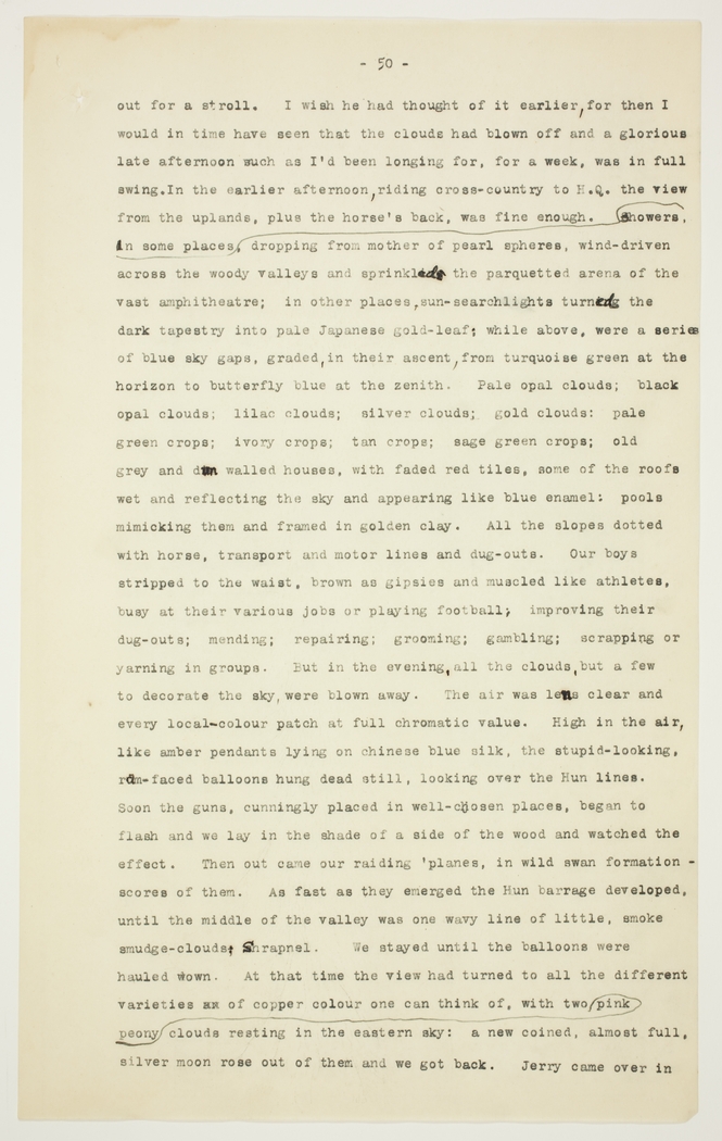 out for a stroll. I wish he had thought of it earlier, for then I would in time have seen that the clouds had blown off and a glorious late afternoon such as I'd been longing for, for a week, was in full swing. In the earlier afternoon, riding cross-country to H.Q. the view from the uplands, plus the horse's back, was fine enough. In some places, showers dropping from mother of pearl spheres, wind-driven across the woody valleys and sprinkled the parquetted arena of the vast amphitheatre; in other places, sun-searchlights turned the dark tapestry into pale Japanese gold-leaf; while above, were a series of blue sky gaps, graded, in their ascent, from turquoise green at the horizon to butterfly blue at the zenith. Pale opal clouds; black opal clouds; lilac clouds; silver clouds;, gold clouds: pale green crops; ivory crops; tan crops; sage green crops; old grey and dun walled houses, with faded red tiles, some of the roofs wet and reflecting the sky and appearing like blue enamel; pools mimicking them and framed in golden clay. All the slopes dotted with horse, transport and motor lines and dug-outs. Our boys stripped to the waist, brown as gipsies and muscled like athletes, busy at their various jobs or playing football; improving their dug-outs; mending; repairing; grooming; gambling; scrapping or yarning in groups. But in the evening, all the clouds, but a few to decorate the sky, were blown away. The air was lens clear and every local-colour patch at full chromatic value. High in the air, like amber pendants lying on Chinese blue silk, the stupid-looking, ram-faced balloons hung dead still, looking over the Hun lines.