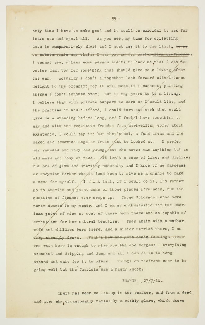 I believe that with private support to work as I would like, and the practise it would afford, I could turn out work that would give me a standing before long, and I feel I have something to say and with the requisite freedom from shrivelling worry about existence, I could say it; but that's only a fond dream and the naked and somewhat angular Truth must be looked at. I prefer her rounded and rosy and young, but she never was anything but an old maid and bony at that. It isn't a case of likes and dislikes but one of glum and snarling necessity and I know of no Maecenas or Endymion Porter who is dead keen to give me a chance to make a name for myself. I think that, if I could do it, I'd rather go to America and paint some of those places I've seen, but the question of finance ever crops up. Those Colorado mesas have never dimmed: in my memory and I am as enthusiastic for the American point of view as most of those born there and as capable of enthusiasm for her natural beauties. Then again with a mother, wife and children born there, and a sister married there, I am very strongly drawn. That's how one gets one's feelings torn. The rain here is enough to give you the Joe Morgans - everything drenched and dripping and damp and all I can do is to hang around and wait for it to clear. Things on the front seem to be going well, but the "Justicia" was a nasty knock.