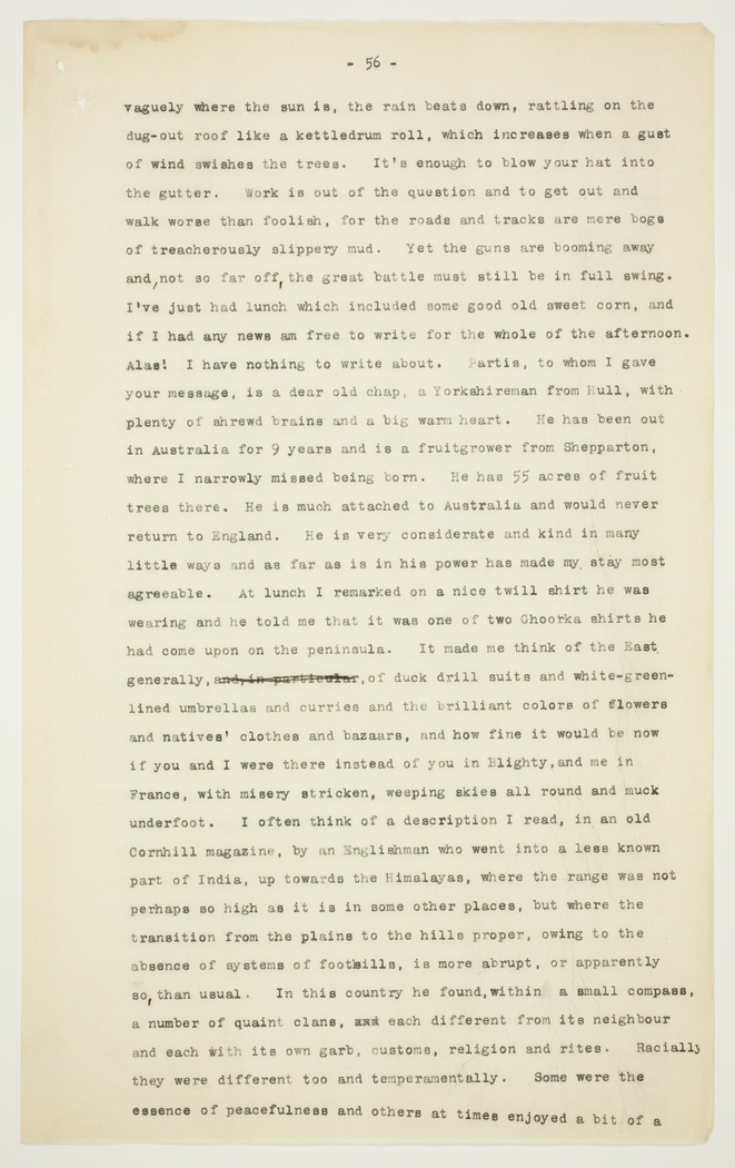 vaguely .here the sun is, the rain beats down, rattling on the dug-out roof like a kettledrum roll, which increases when a gust of wind swishes the trees. It's enough to blow your hat into the gutter. Work is out of the question and to get out and walk worse than foolish, for the roads and tracks are mere bogs of treacherously slippery mud. Yet the guns are booming away and, not so far off, the great battle must still be in full swing. I've just had lunch which included some good old sweet corn, and if I had any news am free to write for the whole of the afternoon. Alas! I have nothing to write about. Partis, to whom I gave your message, is a dear old chap, a Yorkshireman from Hull, with plenty of shrewd brains and a big warm heart. He has been out in Australia for 9 years and is a fruitgrower from Shepparton, where I narrowly missed being born. He has 55 acres of fruit trees there. He is much attached to Australia and would never return to England. He is very considerate and kind in many little ways and as far as is in his power has made my, stay most agreeable. At lunch I remarked on a nice twill shirt he was wearing and he told me that it was one of two Ghoorka [Ghurka] shirts he had come upon on the peninsula. It made me think of the East generally, and in particular of duck drill suits and white-green- lined umbrellas and curries and the brilliant colors of flowers and natives' clothes and bazaars, and how fine it would be now if you and I were there instead of you in Blighty and me in France, with misery stricken, weeping skies all round and muck underfoot. I often think of a description I read, in an old Cornhill magazine, by an Englishman who went into a less known part of India, up towards the Himalayas, where the range was not perhaps so high as it is in some other places, but where the transition from the plains to the hills proper, owing to the absence of systems of foothills, is more abrupt, or apparently so, than usual. In this country he found, within a small compass, a number of quaint clans, each different from its neighbour and each with its own garb, customs, religion and rites. Racially they were different too and temperamentally. Some were the essence of peacefulness and others at times enjoyed a bit of a