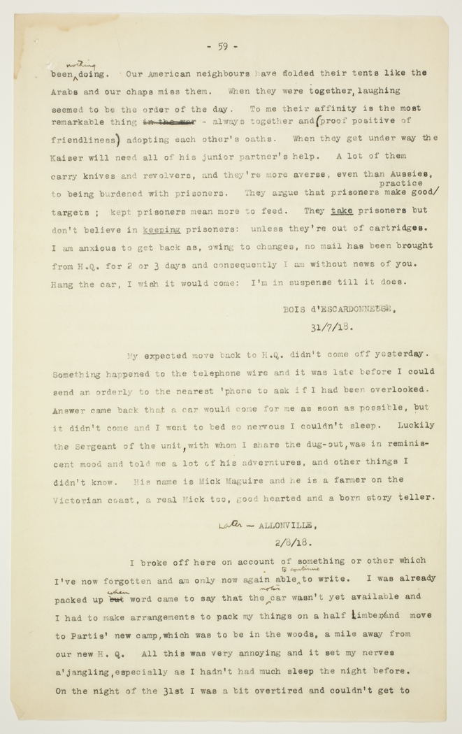 been nothing doing. Our American neighbours have folded their tents like the Arabs and our chaps miss them. When they were together, laughing seemed to be the order of the day. To me their affinity is the most remarkable thing in the war - always together and (proof positive of friendliness), adopting each other's oaths. When they get under way the Kaiser will need all of his junior partner's help. A lot of them carry knives and revolvers, and they're more averse, even than Aussies, to being burdened with prisoners. They argue that prisoners make good practice targets; kept prisoners mean more to feed. They take prisoners but don't believe in keeping prisoners: unless they're out of cartridges. I am anxious to get back as, owing to changes, no mail has been brought from H.Q. for 2 or 3 days and consequently I am without news of you. Hang the car, I wish it would come: I'm in suspense till it does.