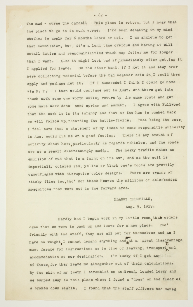 the mud - curse the cards!! This place is rotten, but I hear that the place we go to is much worse. I've been debating in my mind whether to apply for 6 months leave or not. I am anxious to get that commission, but, it's a long time overdue and having it will entail duties and responsibilities which may fetter me for longer than I want. Also it might look bad if immediately after getting it I applied for leave. On the other hand, if I get it and stay over here collecting material before the bad weather sets in, I could then apply and perhaps get it. If I succeeded I think I could go home via N.Y. I then would continue out to Aust. and there get into touch with some one worth while; return by the same route and get some more work done next spring and summer. I agree with Fullwood that the work is in its infancy and that as the Hun is pushed back we will follow up, recording the battle-fields. That being the case, I feel sure that a statement of my ideas to some responsible authority in Aus. would put me on a good footing. There is any amount of activity about here particularly as regards vehicles, and the roads are as a result distressingly muddy. The heavy traffic makes an emulsion of mud that is a thing on its own, and as the soil is impartially colored red, yellow or black one's boots are prettily camouflaged with disruptive color designs. There are swarms of sticky flies too, tho' not thank Heaven the millions of able-bodied mosquitoes that were out in the forward area.