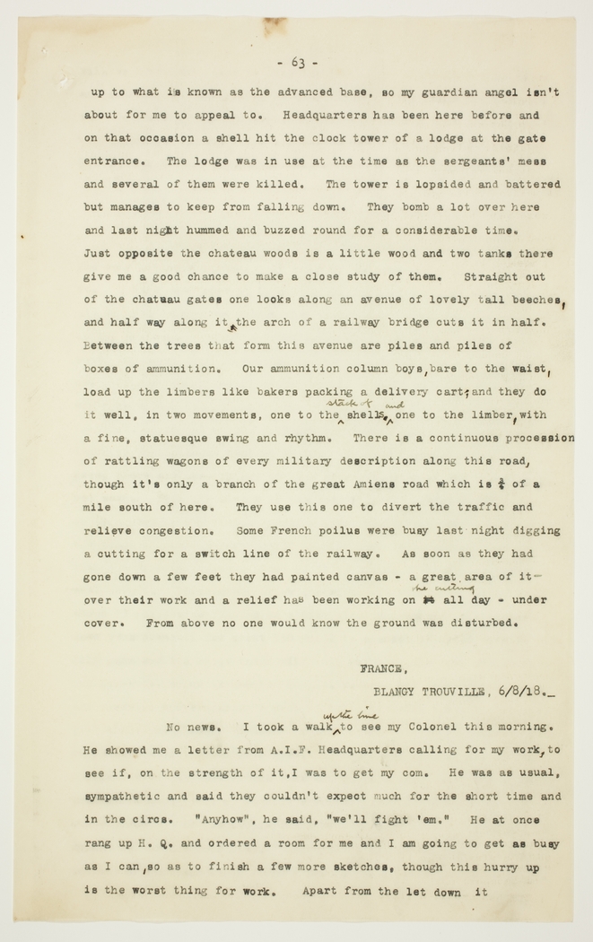 up to what is known as the advanced base, so my guardian angel isn't about for me to appeal to. Headquarters has been here before and on that occasion a shell hit the clock tower of a lodge at the gate entrance. The lodge was in use at the time as the sergeants' mess and several of them were killed. The tower is lopsided and battered but manages to keep from falling down. They bomb a lot over here and last night hummed and buzzed round for a considerable time. Just opposite the chateau woods is a little wood and two tanks there give me a good chance to make a close study of them. Straight out of the chateau gates one looks along an avenue of lovely tall beeches, and half way along it, the arch of a railway bridge cuts it in half. Between the trees that form this avenue are piles and piles of boxes of ammunition. Our ammunition column boys, bare to the waist, load up the limbers like bakers packing a delivery cart, and they do it well, in two movements, one to the stack of shells and one to the limber, with a fine, statuesque swing and rhythm. There is a continuous procession of rattling wagons of every military description along this road, though it's only a branch of the great Amiens road which is ¾ of a mile south of here. They use this one to divert the traffic and relieve congestion. Some French poilus were busy last night digging a cutting for a switch line of the railway. As soon as they had gone down a few feet they had painted canvas - a great area of it — over their work and a relief has been working on the cutting all day - under cover. From above no one would know the ground was disturbed.