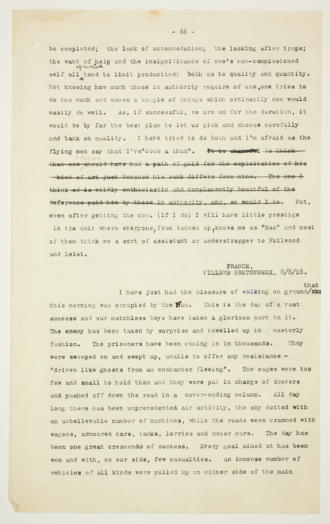 I have just had the pleasure of walking on ground that this morning was occupied by the Hun. This is the day of a vast success and out matchless boys have taken a glorious part in it. The enemy has been taken by surprise and towelled up in masterly fashion. The prisoners have been coming in in thousands. They were swooped on and swept up, unable to offer any resistance – "driven like ghosts from an enchanter fleeing". The cages were too few and small to hold them and they were put in charge of drovers and pushed off down the road in a never-ending column. All day long there has been unprecedented air activity, the sky dotted with an unbelievable number of machines, while the roads were crammed with wagons, armoured cars, tanks, lorries and motor cars. The day has been one great crescendo of success. Every goal aimed at has been won and with, on our side, few casualties. An immense number of vehicles of all kinds were pulled up on either side of the main