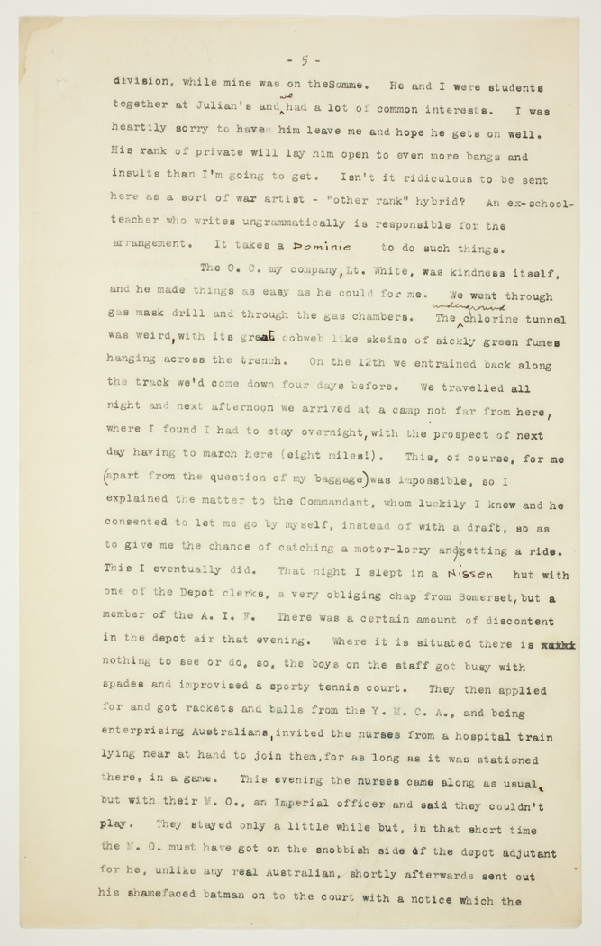 The 0. C. my company, Lt. White, was kindness itself, and he made things as easy as he could for me. We went through gas mask drill and through the gas chambers. The underground chlorine tunnel was weird, with its great cobweb like skeins of sickly green fumes hanging across the trench. On the 12th we entrained back along the track we'd come down four days before. We travelled all night and next afternoon we arrived at a camp not far from here, where I found I had to stay overnight, with the prospect of next day having to march here (eight miles!). This, of course, for me (apart from the question of my baggage) was impossible, so I explained the matter to the Commandant, whom luckily I knew and he consented to let me go by myself, instead of with a draft, so as to give me the chance of catching a motor-lorry and getting a ride. This I eventually did. That night I slept in a Nissen hut with one of the Depot clerks, a very obliging chap from Somerset, but a member of the A. I. f. There was a certain amount of discontent in the depot air that evening. Where it is situated there is nothing to see or do, so, the boys on the staff got busy with spades and improvised a sporty tennis court. They then applied for and got rackets and balls from the Y. M. C. A., and being enterprising Australians, invited the nurses from a hospital train lying near at hand to join them, for as long as it was stationed there, in a game. This evening the nurses came along as usual, but with, their M. 0., an Imperial officer and said they couldn't play. They stayed only a little while but, in that short time the M.O. must have got on the snobbish side of the depot adjutant for he, unlike any real Australian, shortly afterwards sent out his shamefaced batman on to the court with a notice which the
