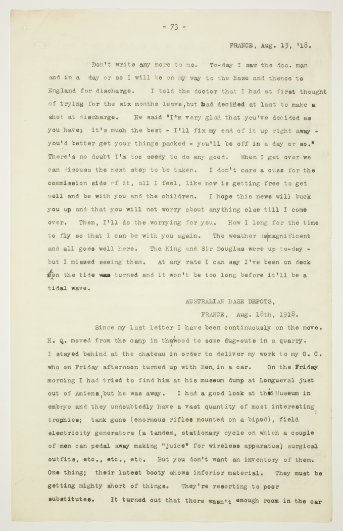 Don't write any more to me. To-day I saw the doc. man and in a day or SO I will be on my way to the Base and thence to England for discharge. I told the doctor that I had at first thought of trying for the six months leave, but had decided at last to make a shot at discharge. He said "I'm very glad that you've decided as you have; it's much the best – I'll fix my end of it up right away - you'd better get your things packed - you'll be off in a day or so." There's no doubt I'm too seedy to do any good. When I get over we can discuss the next step to be taken. I don't care a cuss for the commission side of it, all I feel, like now is getting free to get well and be with you and the children. I hope this news will buck you up and that you will not worry about anything else till I come over. Then, I'll do the worrying for you. How I long for the time to fly so that I can be with you again. The weather is magnificent and all goes well here. The King and Sir Douglas were up to-day - but I missed seeing them. At any rate I can say I've been on deck when the tide turned and it won't be too long before it'll be a tidal wave.