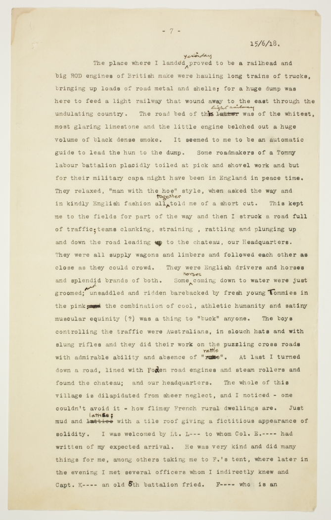 The place where I landed yesterday proved to be a railhead and big ROD engines of British make were hauling long trains of trucks, bringing up loads of road metal and shells; for a huge dump was here to feed a light railway that wound away to the east through the undulating country. The road bed of this light railway was of the whitest, most glaring limestone and the little engine belched out a huge volume of black dense smoke. It seemed to me to be an automatic guide to lead the hun to the dump. Some roadmakers of a Tommy labour battalion placidly toiled at pick and shovel work and but for their military caps, might have been in England in peace time. They relaxed, "man with the hoe" style, when asked the way and in kindly English fashion altogether told me of a short cut. This kept me to the fields for part of the way and then I struck a road full of traffic; teams clanking, straining, rattling and plunging up and down the road leading up to the chateau, our Headquarters. They were all supply wagons and limbers and followed each other as close as they could crowd. They were English drivers and horses and splendid brands of both. Some horses coming down to water were just groomed; and unsaddled and ridden barebacked by fresh young Tommies in the pink. The combination of cool, athletic humanity and satiny muscular equinity (?) was a thing to "buck" anyone. The boys controlling the traffic were Australians, in slouch hats and with slung rifles and they did their work on the puzzling cross roads with admirable ability and absence of "rattle". At last I turned down a road, lined with Foden road engines and steam rollers and found the chateau; and our headquarters. The whole of this village is dilapidated from sheer neglect, and I noticed - one couldn't avoid it - how flimsy French rural dwellings are. Just mud and lattice; with a tile roof giving a fictitious appearance of solidity. I was welcomed by Lt. L--- to whom Col. E.---- had written of my expected arrival. He was very kind and did many things for me, among others taking me to F.'s tent, where later in the evening I met several officers whom I indirectly knew and Capt. K---- an old 5th battalion fried. F--- who is an