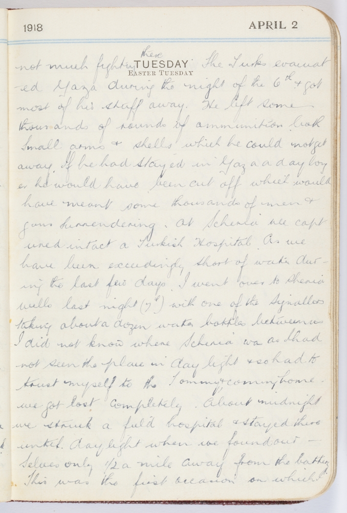 As we have been exceedingly short of water during the last few days I went over to Sheria wells last night (7th) with one of the Signallers taking about a dozen water bottles between us. I did not know where Scheria [Sheria] was as I had not seen the place in daylight & so had to trust myself to the Tommy & coming home we got lost completely. About midnight we struck a field hospital & stayed there until daylight when we found ourselves only ½ a mile away from the battery.