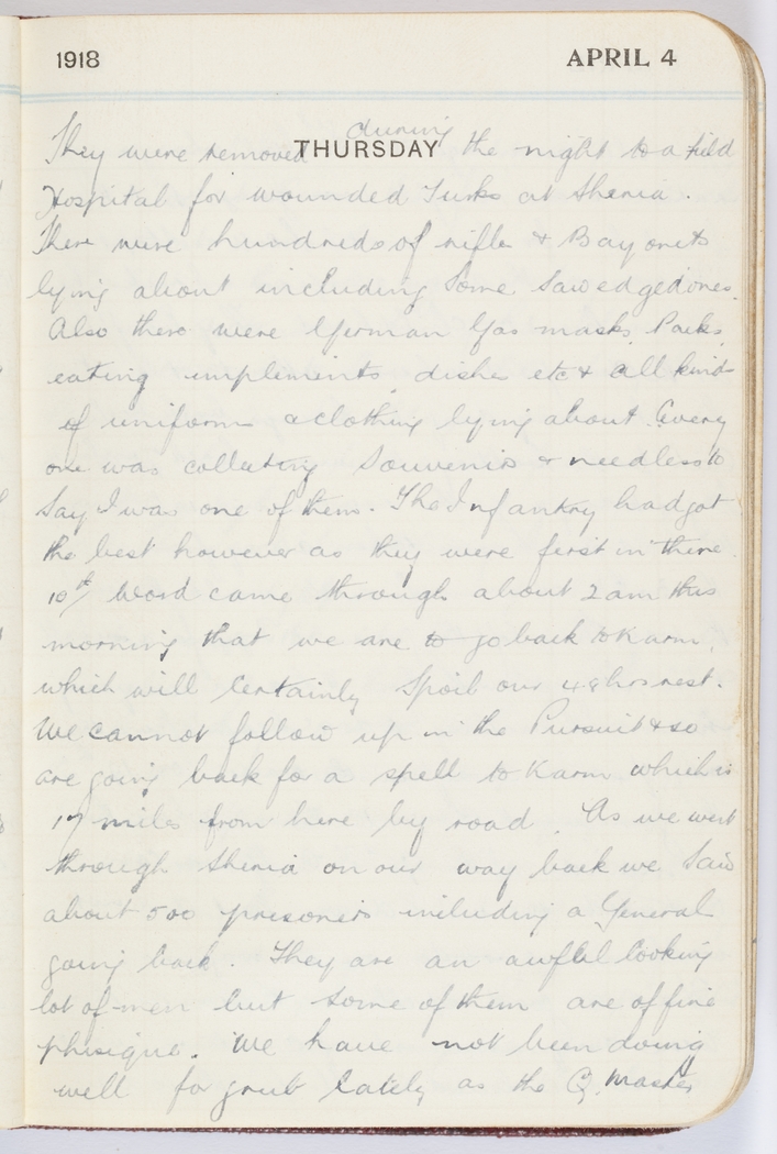 There were hundreds of rifles & bayonets lying about including some saw edged ones. Also there were German Gas masks, Packs, eating implements, dishes etc & all kind of uniforms & clothing lying about. Every one was collecting souvenirs & needless to say I was one of them. The Infantry had got the best however as they were first in there.