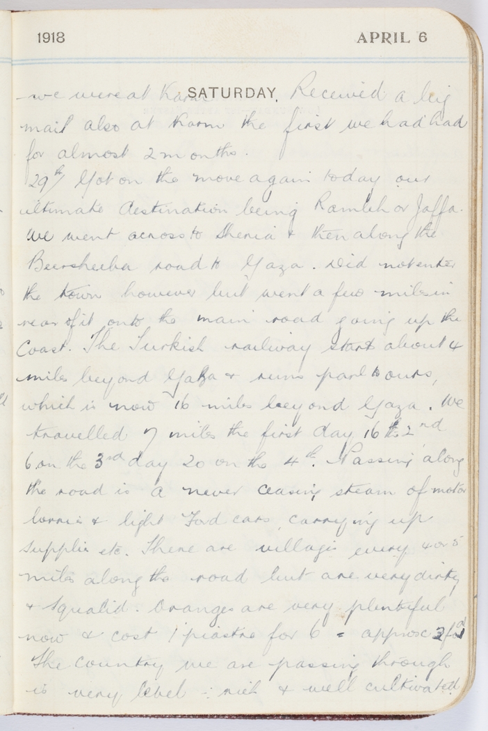 Got on the move again today our ultimate destination being Ramleh or Jaffa. We went across to Sheria & then along the Beersheeba [Beersheba] road to Gaza. Did not enter the town however but went a few miles in rear of it onto the main road going up the coast. The Turkish railway starts about 4 miles beyond Gaza & runs parl to ours, which is now 16 miles beyond Gaza. We travelled 7 miles the first day, 16 the 2nd, 6 on the 3rd day, 20 on the 4th.