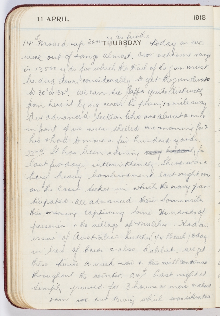 Moved up 2,000 yds further today as we were out of range almost, our extreme range is 13,500 yds for which the trail of the gun must be tug down considerably to get the gun elevated to 30º or 32°. We can see Jaffa quite distinctly from here it lying across the plain 12 miles away.