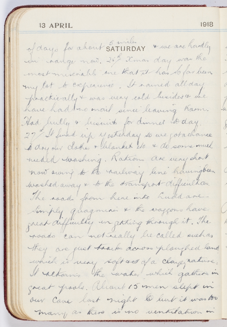 Xmas day was the most miserable one that it has so far been my lot to experience. It rained all day practically & was very cold besides & we have had no mail since leaving Karm. Had bully & biscuits for dinner today.